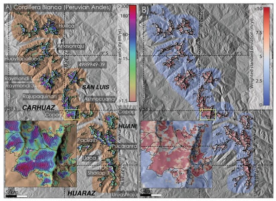Figure 1A presents the first complete high-resolution mapping of the surface speed of the glaciers of the Cordillera Blanca, located in the Peruvian Andes, from more than 5300 pairs of Sentinel-2 images. This region is characterized by glaciers of a typical length of 1 to 3 km, reduced ablation zones surrounded by steep mountain walls [30]. The variance or standard deviation in surface displacement (Figure 1B) varies from 1 to 3 m/year over ice-free areas and can reach more than 10 m/year over glaciers, which probably represents not only sensor noise but also significant changes in surface speed that can occur during the year due to seasonal changes and local climatic conditions. We note that a much smaller number of image pairs were processed on the eastern side of the mountain range, as shown in Figure S4A, with only 150 to 200 successful pairs compared to more than 500 on the western side of the cordillera. We attribute this difference to the higher probability of cloud cover from the Amazon basin to the east. As a result, the time average map value on the eastern side of the cordillera is less precise than in the western part.