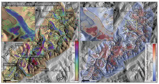 (A) Glacier surface velocity mosaic of the Mont-Blanc massif (European Alps) in meters per year averaged over 2017–2018 from Sentinel-2 images. Colorbar is coded on a logarithmic scale and overlaid on a shaded relief version of the SRTM DEM; (B) Weighted standard deviation color coded from white (low variance) to dark red (high variance). Insets show a zoom on the tongue of Argentière glacier for each map.