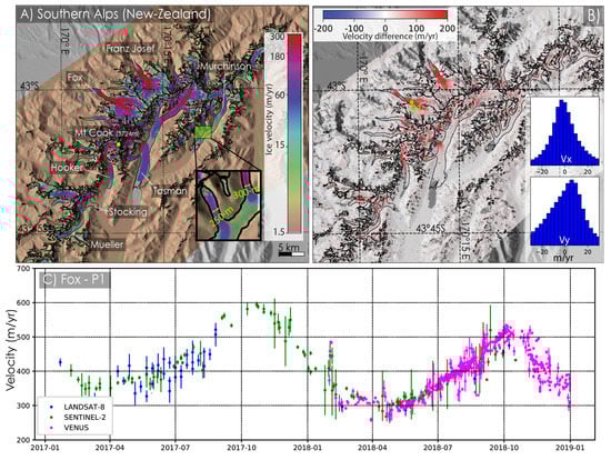 (A) Glacier surface velocity mosaic of the Tasman Glacier area in meters per year averaged over 2016–2018 quantified from Sentinel-2 images, colorbar is coded on a logarithmic scale going from brown (slow) to red (fast). Inset shows a zoom on two tributaries of Murchinson glacier; (B) Difference between March-July and October-December glacier surface velocities is color coded from blue to red. The inset graph shows the statistics and distribution of displacements on stable ground; (C) Time series of glacier surface velocity from Sentinel-2 (green), Landsat 8 (blue) and Vens (pink) satellites between 2017 and 2018 of the upper part of Fox glacier indicated by a green dot labelled P1 in (B).