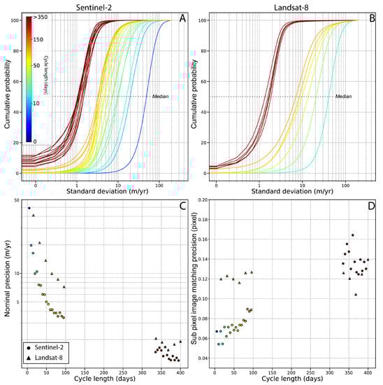 Analysis of Sentinel-2 and Landsat 8 precision in ice-free areas as a function of individual repeat cycles for years 2017 and 2018. (A) Cumulative distribution of the weighted standard deviation values in ice-free areas as a function of the length of the repeat cycle for Sentinel-2 data. Weighted standard deviation is calculated for each pixel of the grid; (B) Same as A for Landsat data; (C) Evolution of the precision as a function of the length of the repeat cycle for Sentinel-2 (circle) and Landsat 8 (triangle). Precision is taken as the median of the distribution in (A,B). (D) Evolution of the sub-pixel matching precision with the cycle length for Sentinel-2 (circle) and Landsat 8 (triangle) based on (C). Repeat cycle is color-coded from red for long to blue for short repeats for all panels.