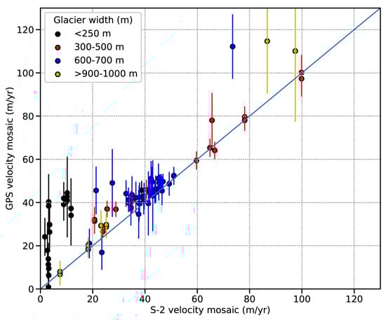 Overall, the mean difference, calculated as the weighted average of the differences between the GPS and Sentinel-2 points, is 6 m/year. The weights are defined as the inverse of the local precision estimated with Sentinel-2 (see Section 3.3.1), GPS measurements are assumed to provide the actual displacement and therefore error-free. If we do not consider glaciers less than 250 m wide, the difference is only 3.7 m/year because, as mentioned above, these glaciers are not well captured by our processing chain. Although the number of comparisons with GPS measurements is statistically low, this suggests that the accuracy of the Sentinel-2 time-averaged map would be less than 10 m/year. The remaining discrepancies could also be due to the difference in time periods between the GPS measurements acquired between 2015–2017 and our map, which is representative of the years 2017 and 2018. Another reason for the differences between in-situ and remote measurements would obviously be the resolution of our map (50 m) which will necessarily spatially “smooth” the motion compared to local GPS measurements.