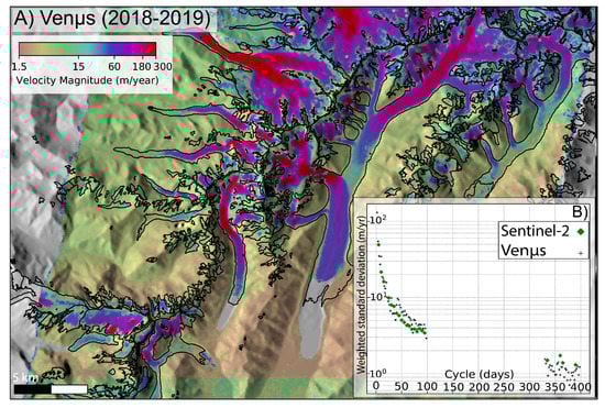 (A) Glacier surface velocity mosaic from Vens images acquired in years 2018 and 2019 over the Tasman Glacier region (Southern Alps of New Zealand); (B) Evolution of precision on stable ground for Vens (black cross) and Sentinel-2 (green diamond) with the length of the repeat cycle.