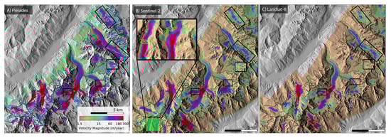 Comparison of glacier surface velocity fields obtained with (A) Pléiades; (B) Sentinel-2; and (C) Landsat 8. The Pléiades mosaic was obtained from a single 30-day pair of late summer 2018 whereas Sentinel-2 and Landsat 8 are 2017–2018 average mosaics of all 30-day and 32-day image pairs, respectively. Inset shows a zoom in the glacier surface velocity of two tributaries of the Miage Glacier called Dome and Mont-Blanc glaciers.