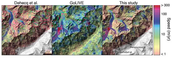 In Figure 8, we compare our Sentinel-2 2017–2018 time-averaged speed map with a map generated from Landsat GoLIVE data available over the Mont Blanc massif [15,37]. We oversample each GoLIVE ice velocity at a resolution of 50 m and follow the same post-processing methodology described in the Section 2.4 (Figure 8). We also compare the results with a previous Landsat 8 map published by [38] that uses a processing chain similar to ours in terms of the parameters used for correlation [24]. Our map like the one in [38] seems to better capture the main glaciers of the Mont Blanc massif such as the Mer de Glace or Leschaux glaciers, with shear margin transitions that are better defined than GoLIVE. It also appears that many small glaciers are not visible in the GoLIVE map, as for example on the Italian side of the massif with the Rochefort and Planpincieux glaciers.