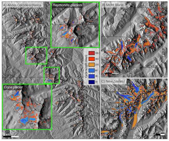 Map of cycle length in days that would be needed to monitor a 10% change in surface velocity with Sentinel-2, for (A) the Cordillera Blanca; (B) The Mont-Blanc massif in the Alps; and (C) the Tasman Glacier region in New Zealand. Note that, when a 10% change in glacier surface velocity is too small to be detected, no color is displayed.