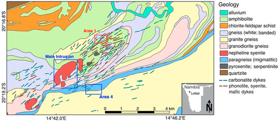 Geological map of the Lofdal Alkaline Carbonatite Complex, including the location of the dyke swarms. Area 1 is located northeast from the Main intrusion (adapted from the Geological Survey of Namibia).