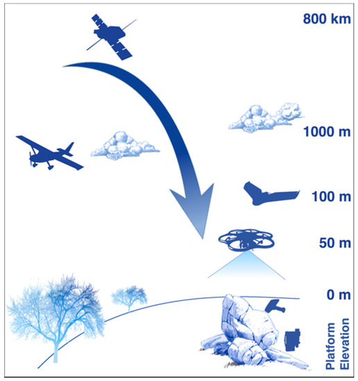 Visual representation of the increase in spatial resolution from satellite sensors, to aircraft- to the high spatial resolution of RPAS-based sensors.