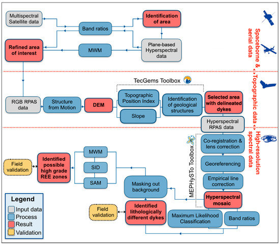 The final level of resolution consists of hyperspectral RPAS-based imagery which was captured with a hexacopter (Bottom section of Figure 4). The RPAS-based hyperspectral data requires specific preprocessing steps and is performed with an in-house toolbox called MEPHySTo (See Appendix A) [28]. After the preprocessing of the RPAS-based hyperspectral imagery, we performed a combination of spectral analyses on the data to map potential REE zones. Spectral Angle Mapper (SAM), Spectral Information Divergence (SID), and MWM were used and compared with one another. MWM is usually preferred as it is fitted to a specific spectral signature. On the other hand, due to the low concentration of target minerals and limited spatial resolutions and SNR of existing sensors, absorption features might be difficult to identify. In that case, classification methods, such as SID and SAM, can provide an indirect tool to identify either the target minerals or proxies. Field work was then performed in the refined study area and included traditional field exploration techniques, such as field mapping and representative sampling.