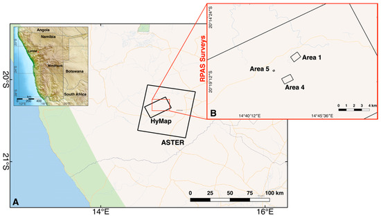 Geographic map showing the spatial extent covered by each data set including an inset of a topographic map of Namibia depicting the location of the Lofdal area. (A) Spatial footprints of ASTER and HyMap data. (B) Spatial foot prints of the areas covered with RPAS-based surveys.