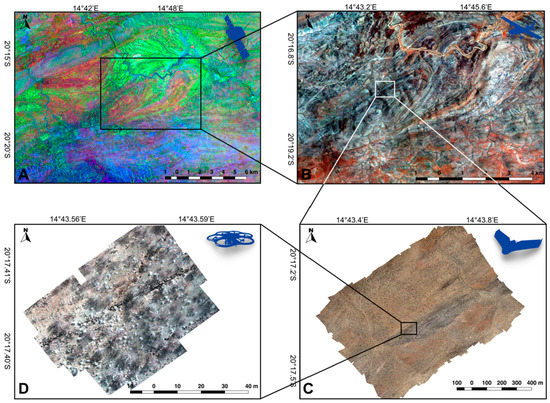 In the first step, we applied commonly used spectral analyses, known for their versatility and robustness, on satellite- and aircraft-based imagery. We chose ASTER data for the first level of resolution and performed lithological mapping and area identification (top section of Figure 4). We mapped the main lithologies of the region by performing selected band ratios. The next level of resolution is provided by plane-based imaging. We performed band ratios and minimum wavelength mapping (MWM) on HyMap imagery and used the results to refine an area of interest (Top section of Figure 4). Once we chose and refined the area of interest, we moved to the next resolution level using RPAS-based sensors. RPAS-based sensors can capture the spectral and topographical data needed to study small scale features (middle and bottom sections of Figure 4).