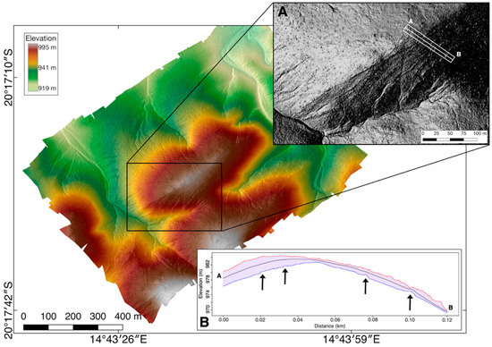 High-resolution Digital Elevation Model (DEM) of Area 1 (cf. Figure 6) derived from Structure-from-motion Multi-Vision-Stereo (SfM-MVS) photogrammetry with a ground resolution of 4.9 cm. Inset A shows a shaded relief section of the DEM where very fine geological structures can be discerned. Inset B shows a swath profile from points A to B, the black arrows point to possible dykes.