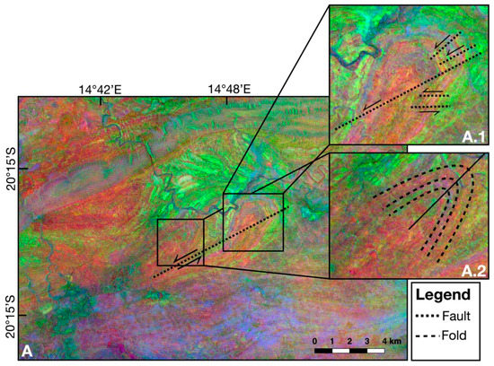 (A) False color composite of the band ratio results on ASTER data showing lithological discrimination (B4/B7, B4/B3, and B2/B1). (A.1) Major faults depicted. (A.2) Indication of folding.
