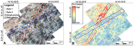 (A) RGB hyperspectral mosaic showing the two types of dykes. The locations of point spectra and rock sampling are shown. (B) Image showing the result of band ratio 760/503 enhancing the iron feature.