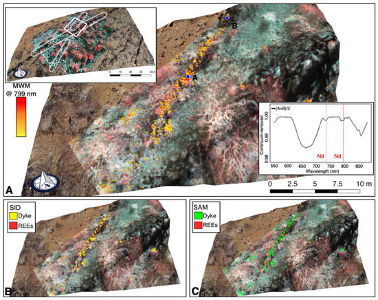 (A) Result of MWM on a selected section of D1 with an inset of the entire Rikola image indicating the locations of the two dykes. Pixels in red contain a deep absorption feature at 799 nm while yellow pixels do not contain an absorption feature. The displayed spectrum shows Nd absorption features, which is the result of averaging the spectra measured at points A and B and was used as reference spectra for SAM and SID. (B) SID result, indicating pixels in red as spectrally similar to REE-hosting rocks. (C) SAM result, indicating pixels in red as spectrally similar to REE-hosting rocks.