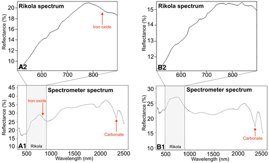 To validate our results, spectra from the hyperspectral images were compared with spectra taken by the handheld spectroradiometer of each dyke (Figure 14). Both handheld spectra show characteristic carbonate absorption features at ~2335 nm, whereas only Dyke 1 shows a broad iron charge-transfer feature in the VNIR (Figure 14A1,B1). This feature characteristically peaks at 780 nm and steeply dips from 900 nm [60]. The spectra from the Rikola range between 450 nm and 900 nm also show the iron feature in Dyke 1 (Figure 14A2,B2).
