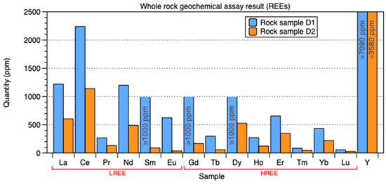 The whole rock geochemical analysis of the two samples shows similar results: Dyke 1 is more enriched in iron and REEs, especially HREEs, than Dyke 2 (Figure 15 and Figure 16). This verifies the XRD results (with higher contents of xenotime in Dyke 1) as well as the in situ handheld XRF measurements, which also indicated that Dyke 1 has a higher amount of Y. The data from geochemical and mineralogical (XRD) investigation are consistent and support the field work and remote sensing findings.