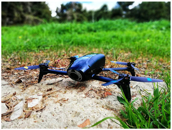 The aerial vehicle used in this work was the Bebop2 [31], a four-rotor UAV from Parrot, shown in Figure 2, with the following characteristics: