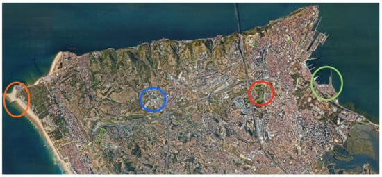 - Green circle: Portuguese Navy’s Naval Base at Alfeite;