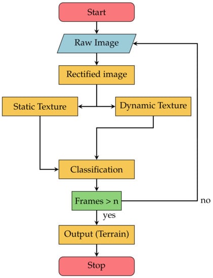 The model of the proposed system, for terrain classification, is presented in Figure 5. As previously mentioned, two main measurements were used in this proposal: Dynamic and Static Textures. Since these two techniques are independent from each other, it is possible to operate it in parallel mode, in order to decrease the time required to process images.