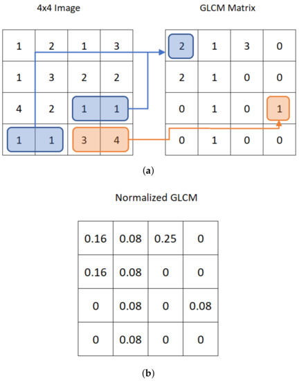 Design of the GLCM matrix from a 4 × 4 image with five gray intensity levels. (a) GLCM matrix with and ; (b) The GLCM normalized matrix.