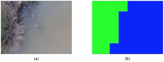 Neural Network response using static features (GLCM and GLRLM). (a) Two terrains in one frame (vegetation and water); (b) NN results (green is vegetation and blue is water).
