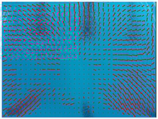 In this work, in order to detect the texture movement, the Farneback algorithm was used [42]. One of the advantages of using the Farneback algorithm is that it provides the flow displacement, , given by the difference in the features between two frames. The flow displacement between features in frame n and can be obtained from Equation (13):