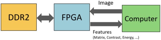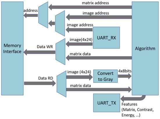 The execution of algorithms for terrain classification is computationally heavy and can lead to lower performance than desired. Field Programmable Gate Array (FPGA) implementations have been used to accelerate the execution of algorithms due to their maximization of parallel processing and lower energy consumption [19]. This features allow FPGA implementations to achieve faster execution times when compared to computer vision software libraries, such as OpenCV, or high performance interactive software for numerical computation, such as MATLAB [20,21]. An FPGA-based real-time tree crown detection approach for large-scale satellite images was proposed in [22] and the results showed a speedup of 18.75 times for a satellite image with a size of 12,188 × 12,576 pixels when compared to a 12-core CPU. An ortho-rectification technique based on an FPGA was presented in [23]. Compared to a PC-based platform, to process the same remotely sensed images, the FPGA-based platform was 4.3 times faster. An onboard georeferencing method for remotely sensed imagery was proposed in [24]. The experimental results showed that using FPGA is 8 times faster than using a PC. An FPGA-based method for onboard detection and matching was presented in [25]. The proposed implementation execution speed is 27 times higher when compared to a PC-based implementation. A pattern recognition architecture based on content addressable memory was implemented in [26] and the results show that the worst-case execution time to recognize a pattern is less than a few microseconds. This is 37.12% less then the previous implemented system based on software pattern recognition algorithms [26]. Hardware accelerators, containing content addressable memory and index 8-bit and 16-bit in parallel with each clock cycle, were implemented in [27]. This system consumes as low as 6.76% and 3.28% of energy compared to CPU and GPU-based designs respectively. In the literature, many other articles can be found, such as [28,29,30], describing the usage of FPGAs to support image processing, in real time. The execution times and/or the energy consumption, may justify the use of FPGAs to implement terrain classification and feature extraction algorithms.