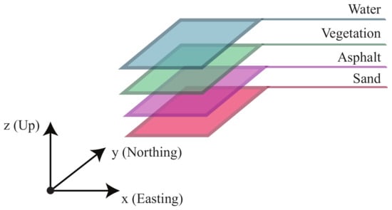 In this paper, four different terrain types (water, vegetation, asphalt and sand) were analyzed, as shown in Figure 3.
