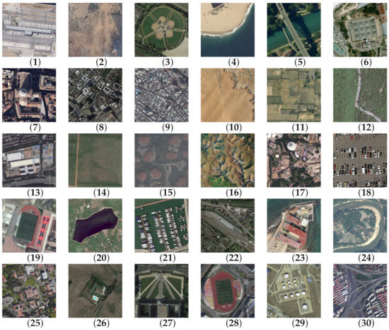 Sample images of the AID dataset: (1) Airport, (2) Bare land, (3) Baseball field, (4) Beach, (5) Bridge, (6) Center, (7) Church, (8) Commercial, (9) Dense residential, (10) Desert, (11) Farmland, (12) Forest, (13) Industrial, (14) Meadow, (15) Medium residential, (16) Mountain, (17) Park, (18) Parking lot, (19) Playground, (20) Pond, (21) Port, (22) Railway station, (23) Resort, (24) River, (25) School, (26) Sparse residential, (27) Square, (28) Stadium, (29) Storage tanks, (30) Viaduct.