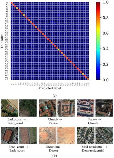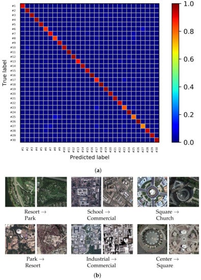 Confusion matrix and some misclassification examples for the AID dataset using the proposed MDFR architecture. (a) Confusion matrix of the AID dataset with OA = 93.64%. (b) Some misclassified samples of the AID dataset.