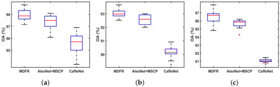 Box plots of different methods. From top to the bottom are the plots by (a) UCM, (b) AID, (c) NWPU.