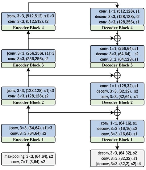 In this paper, we design an asymmetric encoder-decoder semantic segmentation network for paired ship segmentation. Figure 3 shows the architecture of encoder-decoder network, and the left part shows encoder, while the right part is decoder. As shown in Figure 3, “conv” denotes a convolutional layer followed by a batch normalization layer [42] and a ReLU activation function [43]. “” or “” are the kernel size. “” denotes the channels of input and output, respectively. “s2” denotes that the stride is 2 and “s1” denotes that the stride is 1. “deconv” denotes a deconvolutional layer (The deconvolution is also called transposed convolution [35], and responsible to upsample the feature map.) [36] followed by a batch normalization layer and a ReLU activation function.