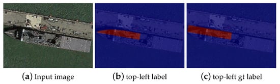 The encoder-decoder paired ship segmentation network has four outputs, which predict four parts of ships, respectively. There are two categories (denoted as 0 and 1) in each output. For example, for the ship in Figure 4a, the ground-truth segmentation label of the output for the top-left part is shown in Figure 4b, in which we take the pixels in top-left part of the ship (denoted as red color) as positive samples (i.e., 1), and the pixels in other areas (denoted as blue color) as negative samples (i.e., 0). The top-left part segmentation label Figure 4b can be obtained from the whole ship segmentation label. However, compared with the detection label (a rectangle determined by four points), it is much difficult to annotate the segmentation label (an object area determined by a large number of points). Although there exist some modern segmentation annotation tools (e.g., LabelMe https://github.com/CSAILVision/LabelMeAnnotationTool), obtaining accurate segmentation label for a remote-sensing image dataset is still relatively time-consuming.