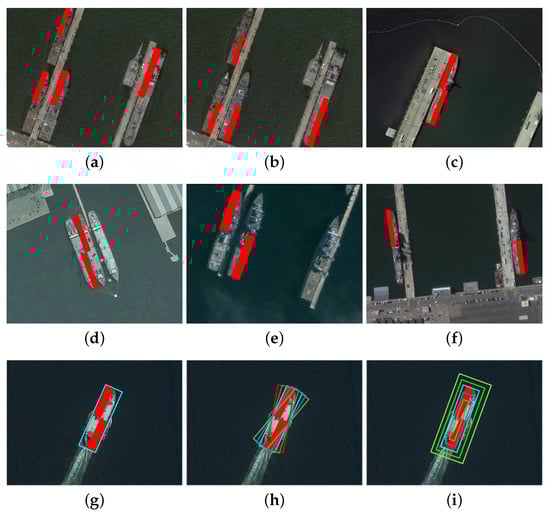 - To improve the recall rate of rotated anchors, as shown in Figure 5h, we rotate the initial anchor with five small angle values (i.e., ). In this way, each initial anchor would produce four other anchors around the same ship. Then, we scale all these anchors with five factors (i.e., 0.6, 0.8, 1.0, 1.2, 1.4) to generate more rotated anchors (see Figure 5i).