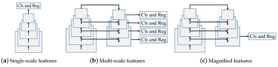 (a) The single-scale features are used to perform classification and regression (Cls and Reg). (b) The multi-scale features are used to perform classification and regression. (c) The magnified features are used to perform classification and regression.