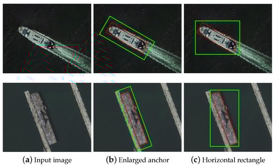 Based on the detection methods for natural images, many CNN-based ship detectors are proposed to improve the ship-detection performance in optical remote-sensing images. However, the horizontal bounding boxes used for detecting objects in natural images are very easy to miss out some inclined ships docked side by side [14,15,16,17,18], and these ships are very common in remote-sensing images. Thus, many CNN-based ship-detection methods propose to use rotated bounding boxes to locate ships in remote-sensing images. Specifically, rotated bounding boxes are predicted from rotated anchors for one-stage detectors [14,17], and from rotated region proposals for two-stage detectors [16].