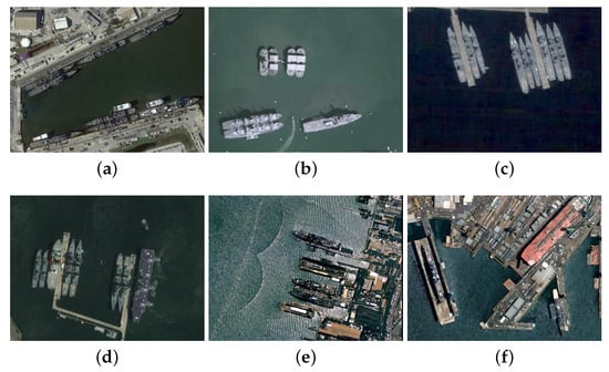 Some images in the ship data set. The ships are in arbitrary orientations, and usually closely docked side by side (see (a–d). The background in some images can be very complex (see (e–f)).