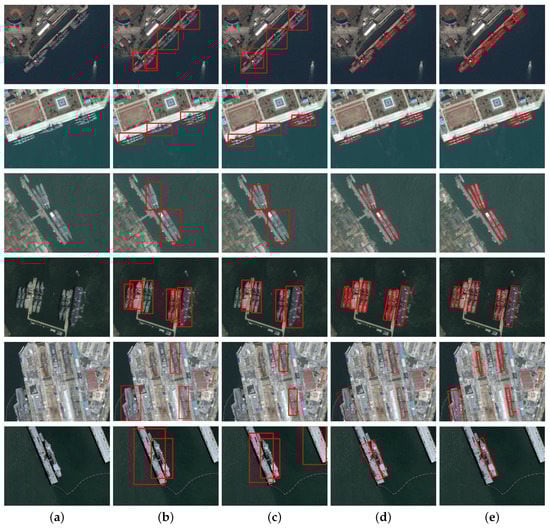 The ship-detection results from different methods. The images from the first row to the fourth row contain many closely docked ships. For the optical remote-sensing images in the last two rows, the backgrounds and the ship objects have very similar textures and appearances. Our method gives accurate detection results for all these cases. (a) Input; (b) Faster R-CNN [9]; (c) SSD [10]; (d) R-DFPN [16]; (e) Ours.