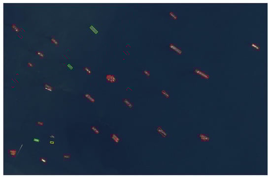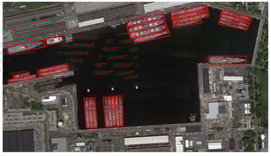 We also test the proposed method on two large-scale optical remote-sensing images. We partition the large-scale image into multiple small-scale images of resolution 1024 × 768, and run each small-scale image using the proposed detection network to output the location of each ship. We use sliding-window strategy with overlap of 20% to partition large-scale images. Figure 10 shows a large-scale remote-sensing image with resolution 4356 × 2589, and the red boxes in the image denote the detection results from our method, and the yellow boxes denote the missed ship objects, and the green boxes indicate the wrong detections. We can see that the detection results are very accurate, and there only exist several missed and wrong bounding boxes. Figure 11 gives another large-scale image with resolution 2605 × 1475, and the image contains many closely docked ships. In this situation, the proposed method can still give satisfactory detection performance.