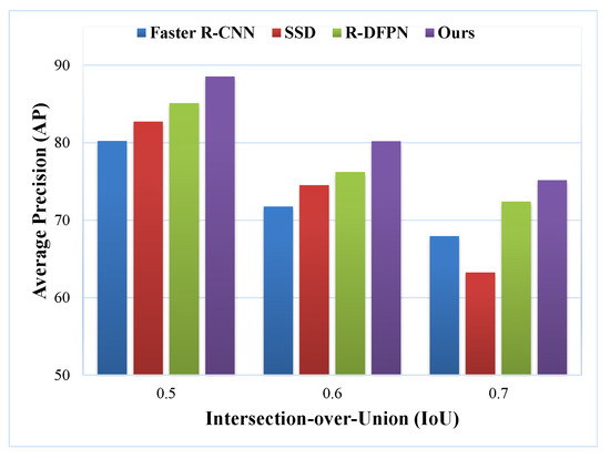 We use Average Precision (AP) to quantitatively evaluate the performance of different detection algorithms. Generally, many detection methods usually set IoU of 0.5 to compute AP. To provide more comprehensive comparison in this paper, we compute and compare AP under different IoU values (i.e., 0.5, 0.6, 0.7) for the four detection methods. Figure 12 shows comparison of AP of different detection methods. The x-axis denotes the value of IoU, and the y-axis denotes the value of AP. We can see that our method is able to produce the highest AP under different IoU values, which indicates the superiority of the proposed method.