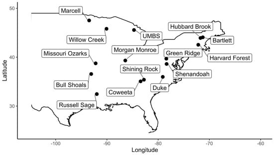 Fifteen DB sites were selected to illustrate the application of our algorithm. As this study aimed to provide an initial proof-of-concept, we tried to maintain homogeneity in the associated satellite pixels, using Google Earth to pick sites that were at least the width of a GOES pixel (~1 km) from another land cover type (e.g., grassland, urban, or large water body). Specific site locations can be found in Figure 1 and site characteristics are given in Table 1. Metadata on the sites is available on the PhenoCam Network website (https://phenocam.sr.unh.edu/webcam/).