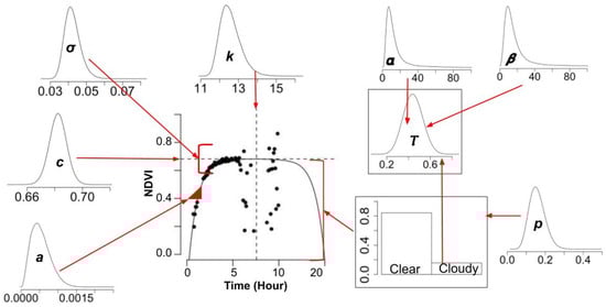 The overall model (i.e., the model including the components described in Section 2.3.1 and Section 2.3.2) was fit using standard Bayesian Markov Chain Monte Carlo (MCMC) approaches using JAGS called from R [] using the rjags [] and runjags [] packages for all days with >10 observations. The analysis was run independently for each site and day using five chains. All models converged, as assessed using the Gelman–Brooks–Rubin statistic (GBR < 1.05), and all effective samples sizes >5000 after burn-in were removed. Model credible intervals (95%) were calculated using 10,000 random samples from the joint posterior distribution. The curve shape parameters (a, c, and k), and the statistical parameters p, α, and β each have one posterior distribution per pixel per day (Figure 2). In contrast, the posterior distributions for T and isCloudy differ for each observation. Thus, each day’s α and β distributions denote one beta distribution, which represents the distribution of the T values of the different ti throughout that day. Likewise, the distribution describing the probability of clouds is the same for each observation of the day, but the 0/1 state of whether a cloud is assumed to be obstructing a specific observation is different between observations. In addition to validating against GOES data, this method was also validated against simulated pseudo-data, which is shown in the supplementary materials Figure S2.