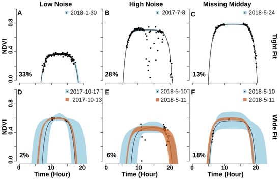 To understand the applicability of the presented diurnal fit method, we investigated which proportion of days fell into different categories based off of the overall noisiness of the data and the uncertainty of the midday maximum estimate. The noisiness of the data was assessed using the width of the 0.025 to 0.975 quantiles range of the data within the four-hour midday window (widths <0.1 NDVI were considered low noise). Days with <5 points within the four-hour midday window were designated as having no midday window. Days that had <0.1 wide 95% CI in the diurnal fit estimated midday maximum values were designated as having low uncertainty. In summary, the six categories were low noise and tight fit, high noise and tight fit, no window and tight fit, low noise and wide fit, high noise and wide fit, and no window and wide fit.