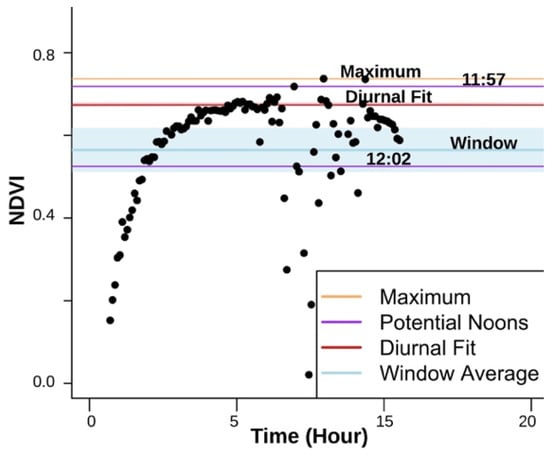 Overall the use of geostationary satellites for reliable NDVI measurements has been limited so far and has not begun to reach its potential as there are still many considerations and limitations. While the viewing angle on geostationary satellites does not change, the solar angle will change, altering the NDVI value that is observed. This results in the NDVI observations increasing in the early morning, plateauing during midday, and then declining again as the sun sets. NDVI theoretically reaches a maximum during the day when the sun is at/near zenith. Instead of only using one measurement per day (e.g., the noon or solar zenith measurements), past studies have looked at using an averaged four-hour midday window estimate to capture the midday NDVI plateau (10:00–14:00) [] or employing techniques used for MODIS corrections, such as the bidirectional reflectance distribution function (BRDF) []. While these techniques provide uncertainty estimates, they are highly sensitive to the cloud mask’s accuracy and do not automatically handle random noise or sporadic atmospheric scattering.