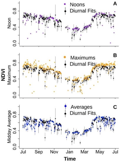Compared to the noon observation and the maximum observation methods, the midday four-hour window average has the benefit of providing a measure of uncertainty. However, because of atmospheric attenuation (e.g., clouds and scattering), more noise is present below the expected NDVI values than above them. By averaging over this window without taking into consideration this unequal distribution of error, this estimate is usually biased too low (Figure 5 and Figure 6C) and the uncertainties are underestimated. Additionally, because the diurnal fit method does not have to predesignate a window timespan, it allows for the estimation of NDVI for more days than the window average method does (76 days/year in our test example) as long as enough measurements are available before and/or after the plateau. The noon observation and window averaging methods are much more sensitive to the accuracy of the cloud mask.
