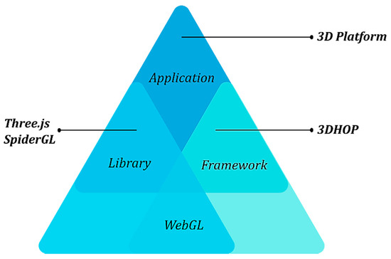The developed platform is a high-level solution that leverages the capabilities of lower-level utilities to achieve the desired degree of customization [40]. The interdependency is scalable according to the level of programming and the expected usability. In particular, it adopts the Nexus’s streaming, rendering and displaying functions that uphold the visualization schema of the 3D models. On scene level, the proposed system partially interferes with the existing settings of 3DHOP and Three.js. It retains the key components of the scene graph, such as the hierarchical structures and the geometry definition and equally modifies some of the appearance properties. In regards to functionality, new programming models of dynamic manipulation of the 3D scene are created based on the build-in features and the native functions of 3DHOP. The degree of 3DHOP’s extension on the scope of interactivity is enhanced by a sophisticated and user-friendly graphical environment. Finally, on integration level, the current solution is independent of its structural components. The incorporation of a complete dataset, the investigation of correlation strategies with the 3D content and the final programming orchestration are autonomous issues, being developed from scratch. As part of the integration, the Three.js library is imported for the generation of multiple viewports on the same page. Besides the creation of advanced computer graphics, it maintains a wide range of loaders for various types of 3D data, including a compatible solution for Nexus.js. The supplementary viewers aim to enhance and clarify the main 3DHOP scene by replacing the ordinary collections of images with collections of individual 3D models. In this way, 3D data of different scale, resolution and level of detail are directly accessed. Figure 2 illustrates the various hierarchical levels of the platform’s components regarding our interference to each codebase. The utilities close to the bottom of the pyramid correspond to low and mid programming levels with zero or little modifications respectively. The 3D platform is the synergistic result of its inferior layers and comprises the visualization interface available to the end users.