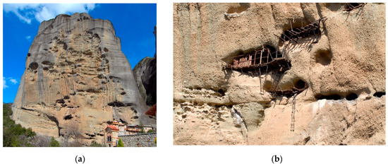 The cavernous asceticism that began around the 11th century in Meteora is of particular religious and cultural significance. The early ascetics established small prayer spaces within the natural cavities of the rocks and gradually organized ascetics as symbiotic places of worship, such as the Dupianite skete in the 12th century. On the northeast side of Pixari rock, at a height of 40 m, the cave hermitage of St. Gregory lies, a cluster of three hermitages with characteristic wood-beamed balconies (Figure 5).