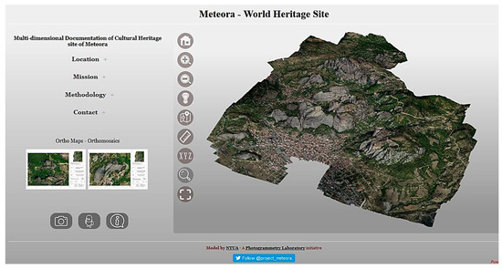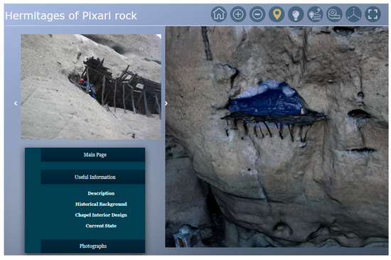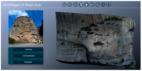 The 3D data are subject to a pre-processing phase in order to be initiated into the visualization pipeline. They are converted to the Nexus multiresolution format prior to their progressive streaming and adaptive rendering to the 3D platform. The Nexus library supports both ply and obj file formats with per-vertex color and texture mapping respectively. In the case of Pixari, a preparation is needed in order to be compatible with conversion’s prerequisites. The accompanied texture image should be per-wedge since the algorithm re-calculates the vertex normal during processing. After conversion, the 3D models are pruned rather than be compressed for lossless size reduction and eventually, attain the eligible encoding for online visualization. The 3D models of Meteora, Pixari and the exterior of St. Stephen’s catholikon are presented in the 3DHOP framework’s environment in the main page and the subpages of the 3D platform accordingly. The data entry and scene declaration happen in three independent HTML files using the basic 3DHOP’s interface. The default graphical user interface of the visualization, including the toolbar and the 3D canvas can be observed in Figure 6a–c. The basic 3D viewer is formatted from a CSS file based on the responsive design. Among other, it determines the position and appearance style of its elements including the toolbar with its individual fields. The 3D model of the interior of St. Stephen’s catholikon is added and loaded as custom Nexus geometry to the Three.js framework in another HTML file (Figure 6).
