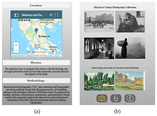 Homepage of the 3D platform with details from the side column: (a) tabs with map location and brief description of the purpose and methodology (b) various image galleries.