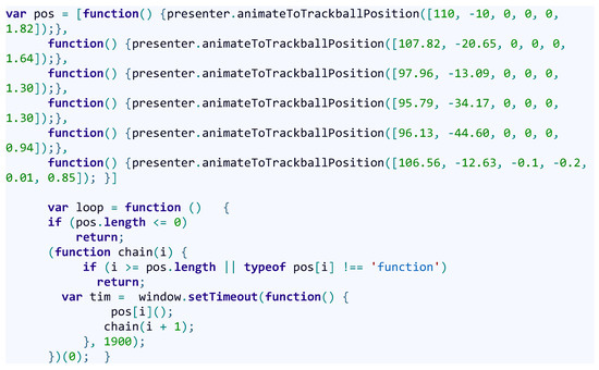 The JavaScript setTimeout method iterates “pos”, the array that contains the anonymous functions with parameter a 3DHOP’s exposed method, within a callback function.